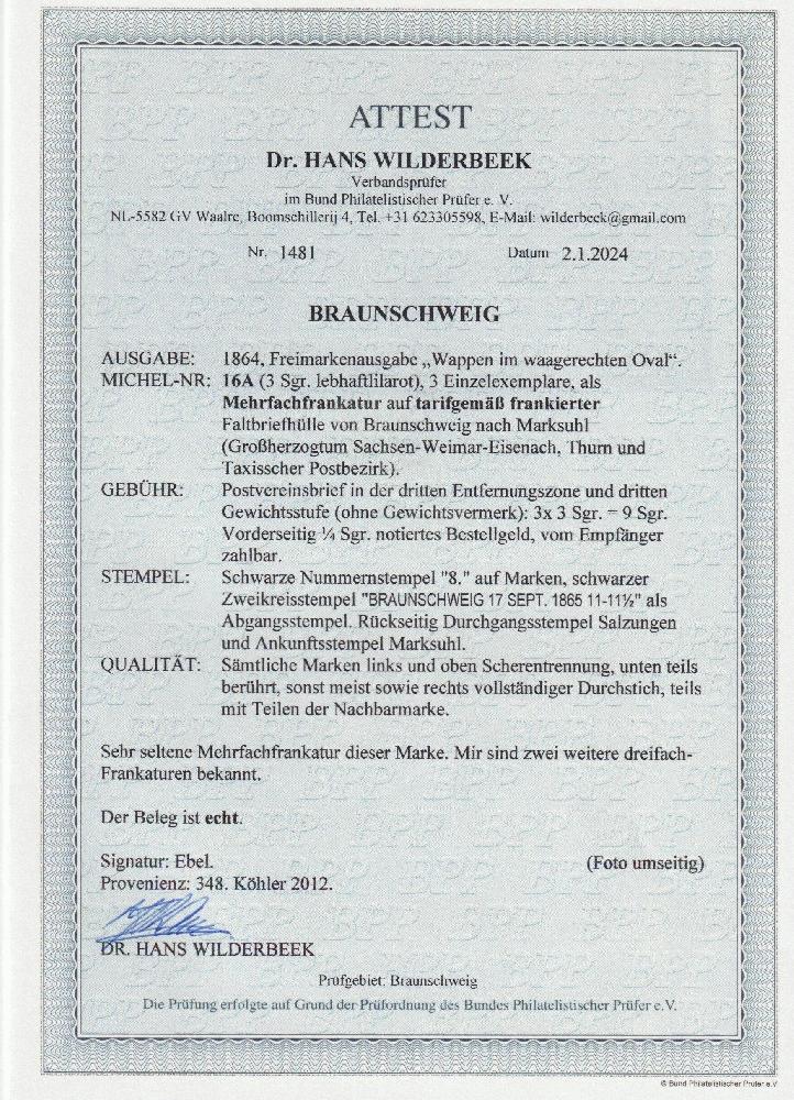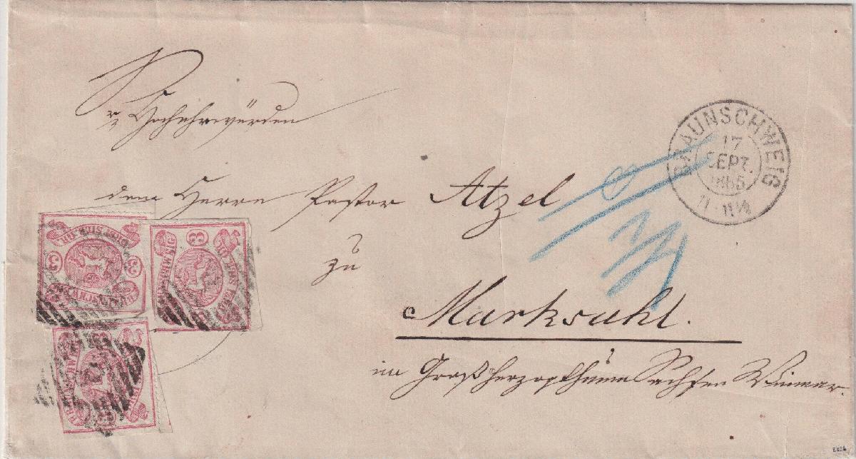 | Zusatzinformationen und Suchstichworte: | Südphila P. Feuser 101. Auktion 16. März 2024 Los 281 Altdeutschland Braunschweig 3 Sgr. rosa, drei Exemplare (mit Scherentrennung) auf Brief der 3.Gewichtsstufe mit Stempel "8" Braunschweig nach Marksuhl/Thüringen (1/4 Sgr. Bestellgeld vorderseitig taxiert), eine außergewöhnlich seltene Mehrfachfrankatur (nur noch zwei weitere Briefe bekannt) Ausruf 500,00 EUR |