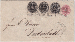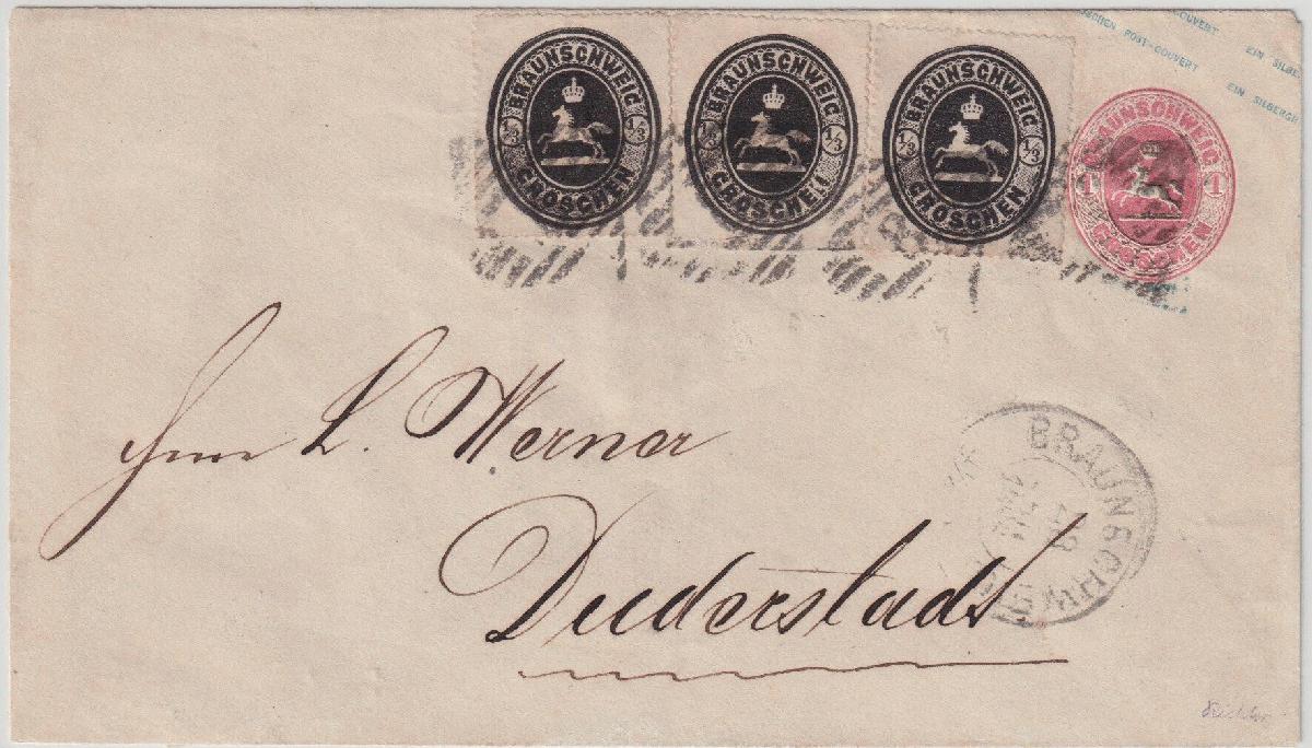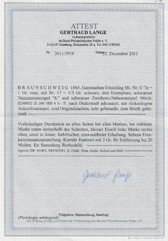 | Zusatzinformationen und Suchstichworte: | Südphila P. Feuser 101. Auktion 16. März 2024 Los 290 Altdeutschland Braunschweig 1/3 Gr. schwarz, drei Exemplare mit vollem Durchstich (linke Marke min. verklebter Einriss) auf Couvert 1 Gr. rosa mit Stempel "8" Braunschweig nach Duderstadt, Buntfrankaturen der Drucksachenmarke 1/3 Gr. sind von größter Seltenheit Ausruf 6.000,00 EUR |