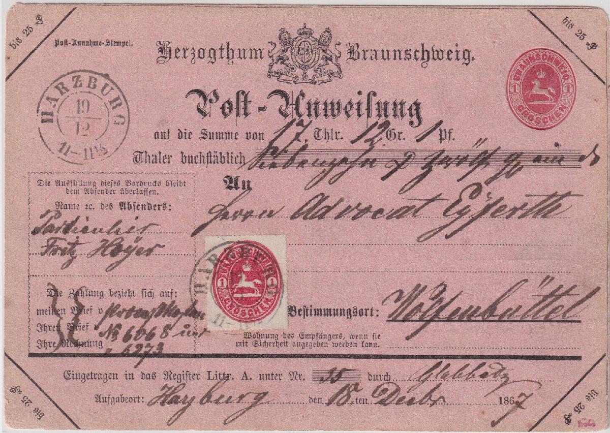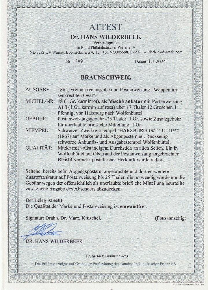 | Zusatzinformationen und Suchstichworte: | Südphila P. Feuser 101. Auktion 16. März 2024 Los 297 Altdeutschland Braunschweig 1 Gr. karmin, Luxusstück mit klarem K2 HARZBURG auf Postanweisung 1 Gr. karmin nach Wolfenbüttel, wegen dem vom Absender unerlaubt angebrachtem Vermerk "Prozesskosten Nr. 6068 und 6273" musste zusätzlich das Briefporto von 1 Sgr. entrichtet werden, sehr selten Ausruf 300,00 EUR |