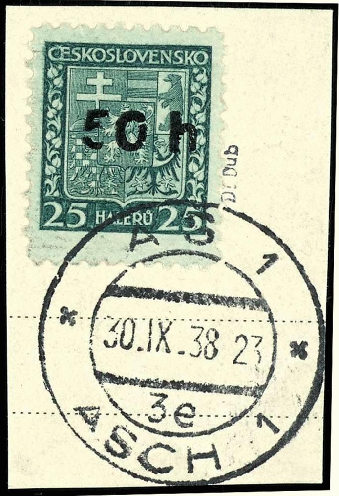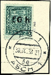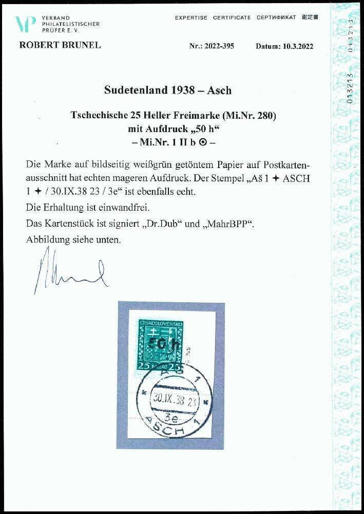 | Zusatzinformationen und Suchstichworte: | Dr. Reinhard Fischer 186. Auktion Auktionstermin: 18. - 21. Mai 2022 Los 3072 Sudetenland Asch 50 h auf 25 Heller Freimarke, magerer Aufdruck, weißgrünes Papier, tadellos gestempelt "As 1 30. IX.38" auf Briefstück, gepr. Dr. Dub, Mahr BPP und Expertise Brunel VP (2022): "Die Erhaltung ist einwandfrei.", Mi. 400.- Zuschlag 170,00 EUR |