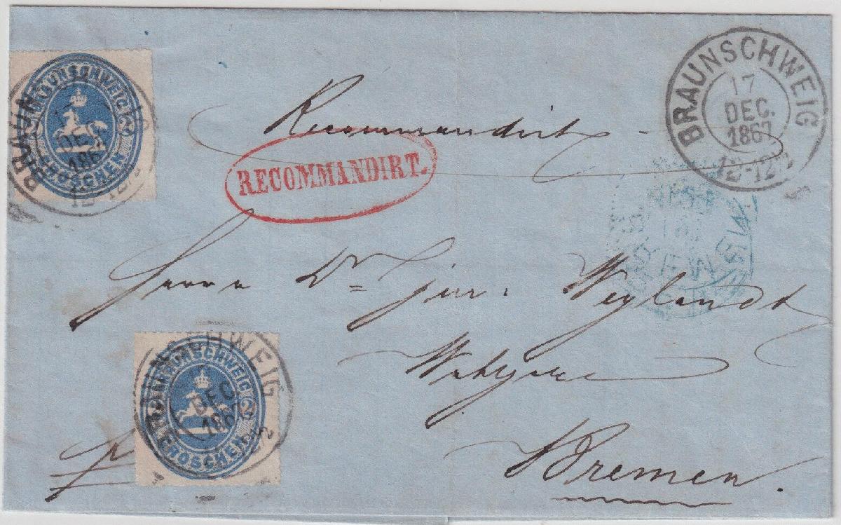 | Zusatzinformationen und Suchstichworte: | Südphila P. Feuser 101. Auktion 16. März 2024 Los 302 Altdeutschland Braunschweig 2 Gr. blau, zweimal (unten nachgestochen) mit K2 BRAUNSCHWEIG auf Recobrief nach Bremen, eine seltene Frankatur Ausruf 150,00 EUR |