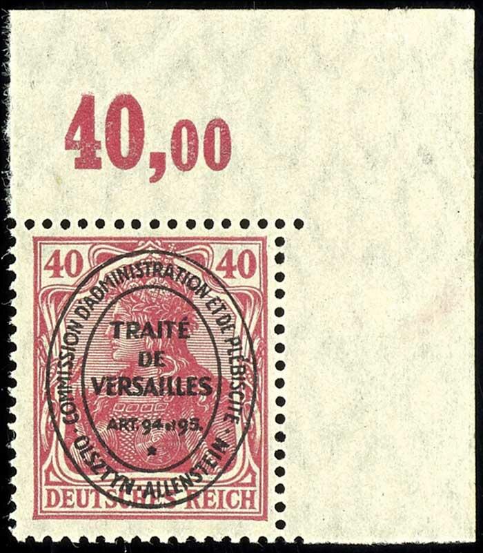 | Zusatzinformationen und Suchstichworte: | Dr. Reinhard Fischer 196. Auktion 1. - 3. Februar 2024 Los 3708 Allenstein Nicht ausgegeben: 40 Pfg Germania mit Ovalaufdruck, Eckrandstück im Plattendruck (Feld 10), tadellos postfrisch Ausruf 150,00 EUR |
