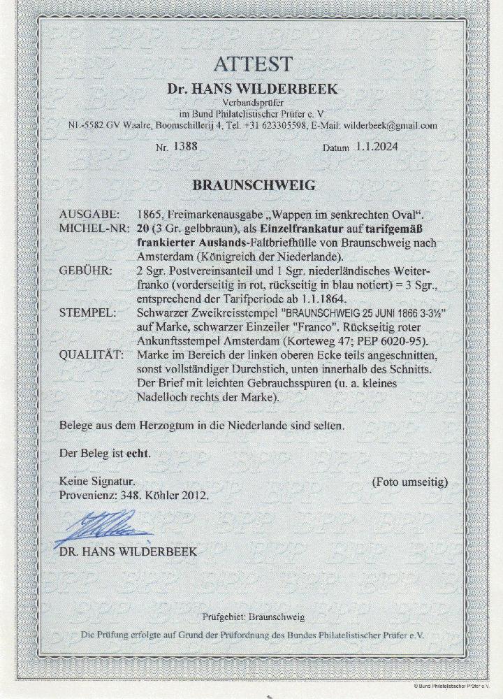 | Zusatzinformationen und Suchstichworte: | Südphila P. Feuser 101. Auktion 16. März 2024 Los 307 Altdeutschland Braunschweig 3 Gr. braun, unbedeutend Scherentrennung, mit K2 BRAUNSCHWEIG nebst L1 FRANCO auf seltenem Brief ("Wfr1" hs.) nach Amsterdam Ausruf 200,00 EUR |