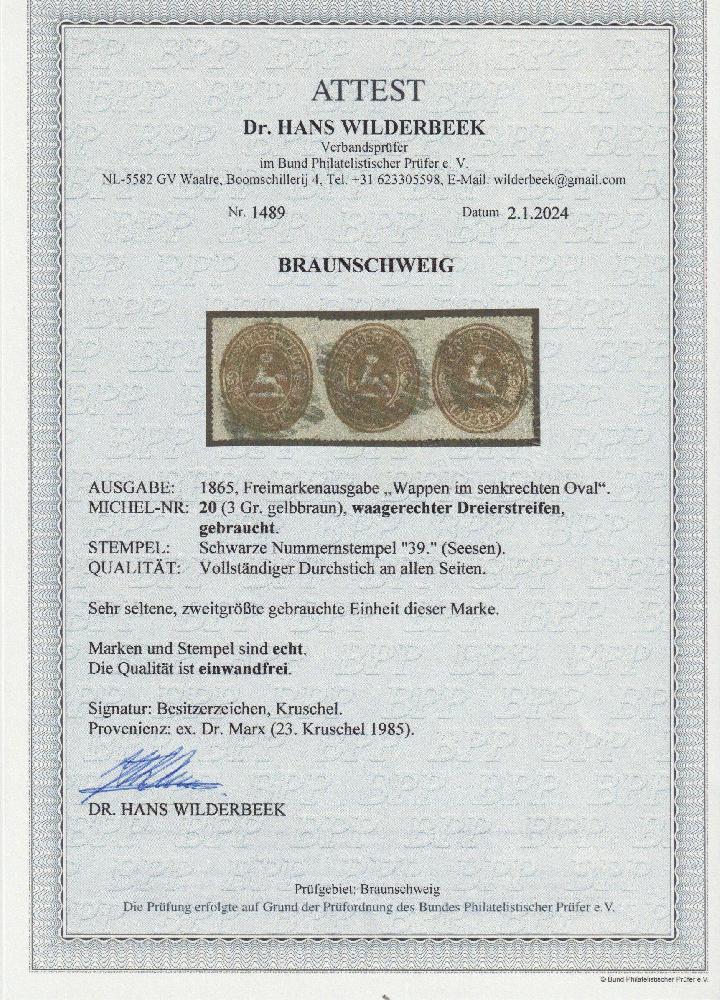 | Zusatzinformationen und Suchstichworte: | Südphila P. Feuser 101. Auktion 16. März 2024 Los 308 Altdeutschland Braunschweig 3 Gr. braun, waagerechter Kabinett-Dreierstreifen mit sauberen Gitterstempeln "39" Seesen eine seltene Einheit Ausruf 300,00 EUR |