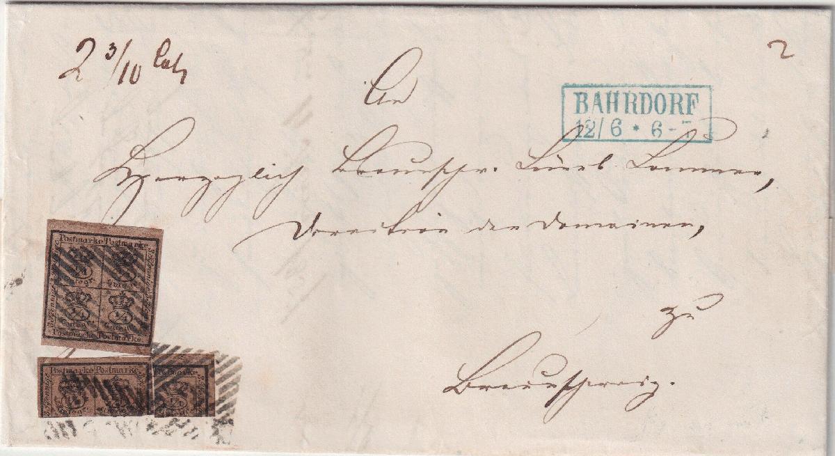 | Zusatzinformationen und Suchstichworte: | Südphila P. Feuser 101. Auktion 16. März 2024 Los 323 Altdeutschland Braunschweig "2" Bahrdorf, klar auf Kabinettbrief der 3. Gewichtsstufe (incl. Bestellgeld) mit breitrandigen 1/4, 2/4 und 4/4 Ggr. a. gelbbraun nach Braunschweig, ein besonders seltener Postort, Liebhaberwert Ausruf 800,00 EUR |