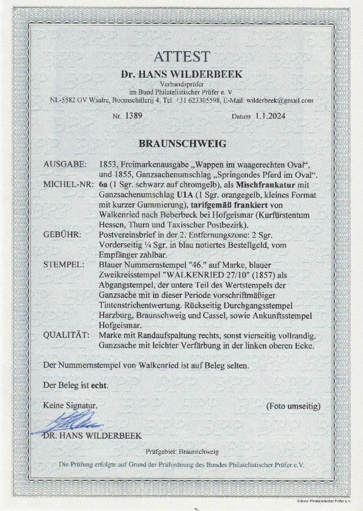 | Zusatzinformationen und Suchstichworte: | Südphila P. Feuser 101. Auktion 16. März 2024 Los 446 Altdeutschland Braunschweig "46" Walkenried, klar auf breitrandiger 1 Sgr. a. bräunlichgelb (kl. Spalt) auf Couvert 1 Sgr, gelb (Randfleck) nach Beberbek bei Hofgeismar, ein schöner Beleg aus dem seltenen Harz-Postort Ausruf 500,00 EUR |