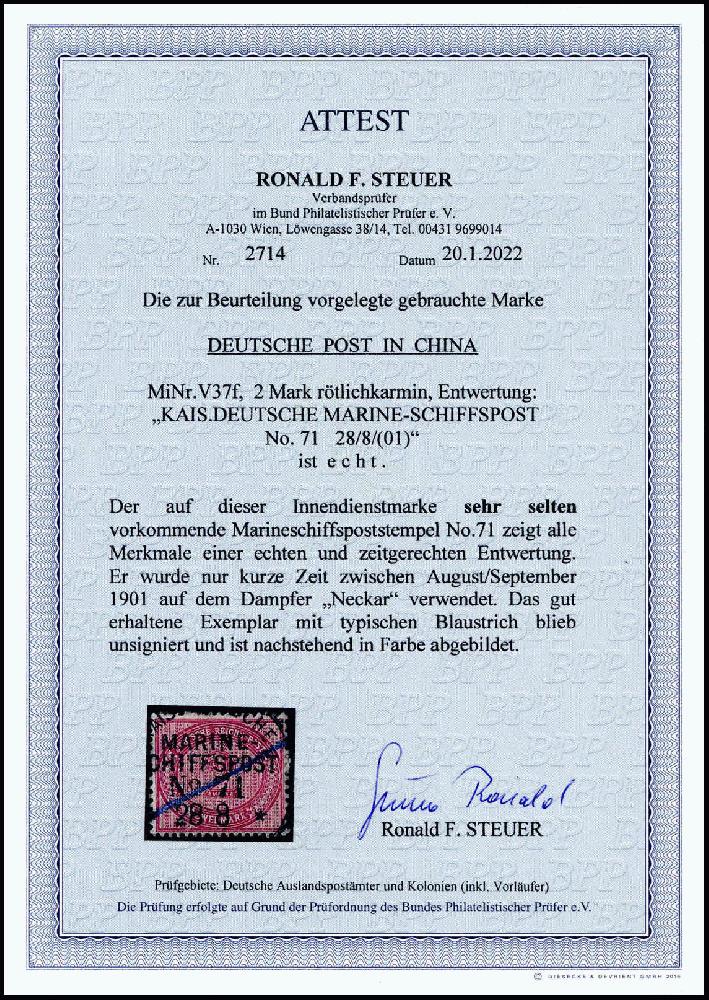| Zusatzinformationen und Suchstichworte: | Los 5137 Deutsche Auslandspost China, Vorläufer Auktionstermin: 18. Juni 2022 2 Mk., tadelloses Exemplar mit zentr. Stempel K.D.MARINE-SCHIFFSPOST No.71 (Dampfer "Neckar") 28/8 (1901) sowie Blaustrich. Eine der seltensten Petschili-Entwertungen, welche nur wenige Tage Ende August/Anfang September 1901 möglich war, Fotoattest Steuer BPP. Ausruf 500,00 EUR |