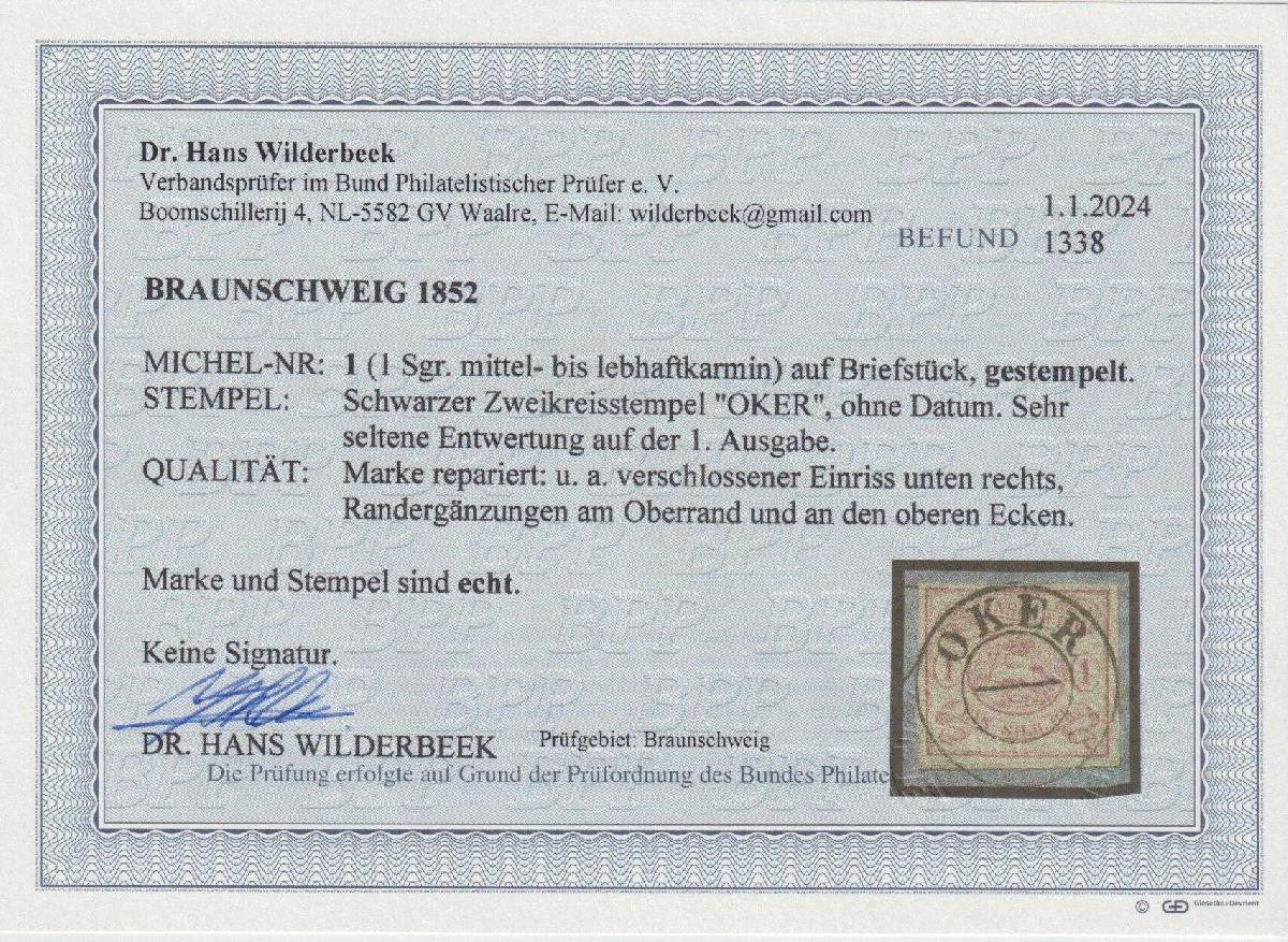 | Prüfer: | Wilderbeek, Hans (BPP (Bund Philatelistischer Prüfer)) |