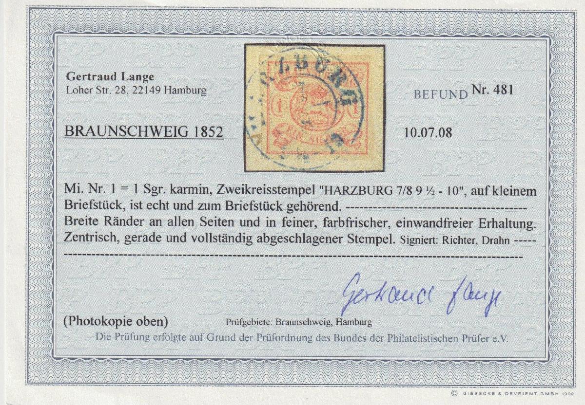 | Zusatzinformationen und Suchstichworte: | Südphila P. Feuser 101. Auktion 16. März 2024 Los 54 Altdeutschland Braunschweig 1 Sgr. lilarosa, breitrandig auf Kabinett-Briefstück mit K2 HARZBURG Ausruf 100,00 EUR |