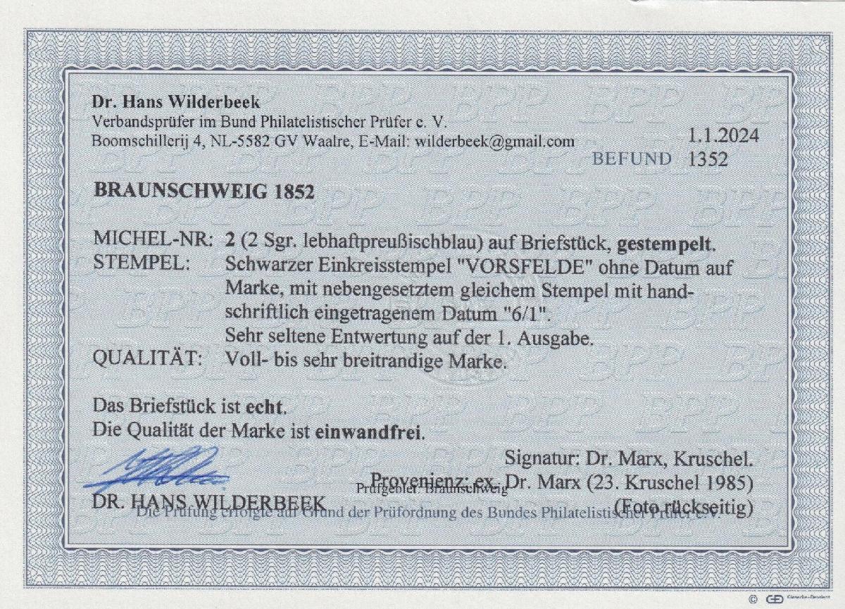 | Zusatzinformationen und Suchstichworte: | Südphila P. Feuser 101. Auktion 16. März 2024 Los 64 Altdeutschland Braunschweig 2 Sgr. blau, breitrandig auf Kabinett-Briefstück mit vorphil. Zier-K1 VORSFELDE (ohne Datum, im Nebenstempel hs.), eine sehr seltene Entwertung Ausruf 300,00 EUR |