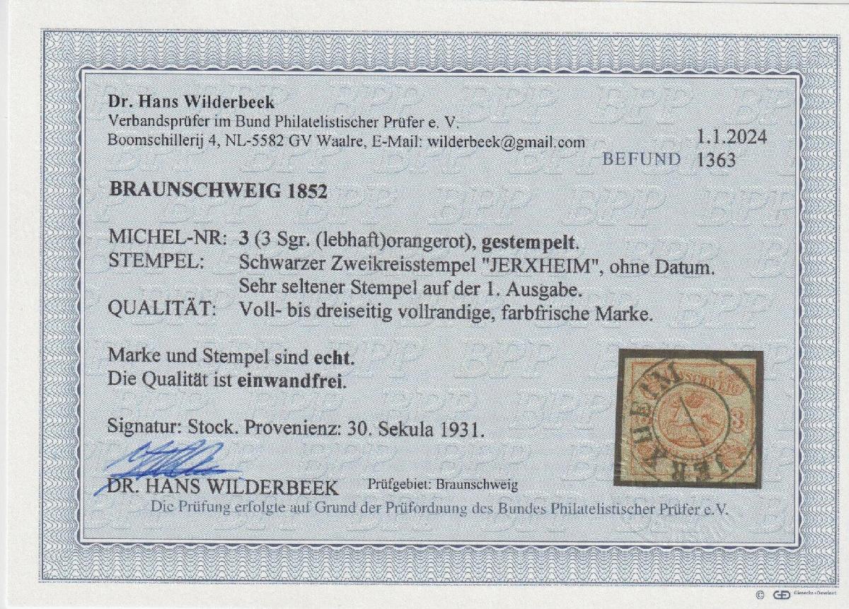 | Zusatzinformationen und Suchstichworte: | Südphila P. Feuser 101. Auktion 16. März 2024 Los 82 Altdeutschland Braunschweig 3 Sgr. orangerot, Luxusstück mit senkr. vorphilatelistischem K2 JERXHEIM, seltene Entwertung Ausruf 150,00 EUR |