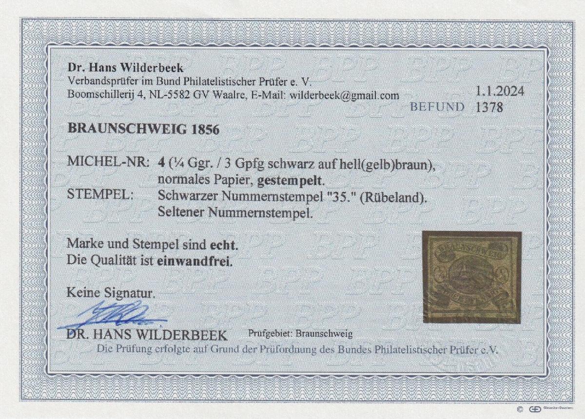 | Zusatzinformationen und Suchstichworte: | Südphila P. Feuser 101. Auktion 16. März 2024 Los 98 Altdeutschland Braunschweig 1/4 Gr. braun, breitrandiges Kabinettstück mit klarem Stempel "35" Rübeland Ausruf 150,00 EUR |