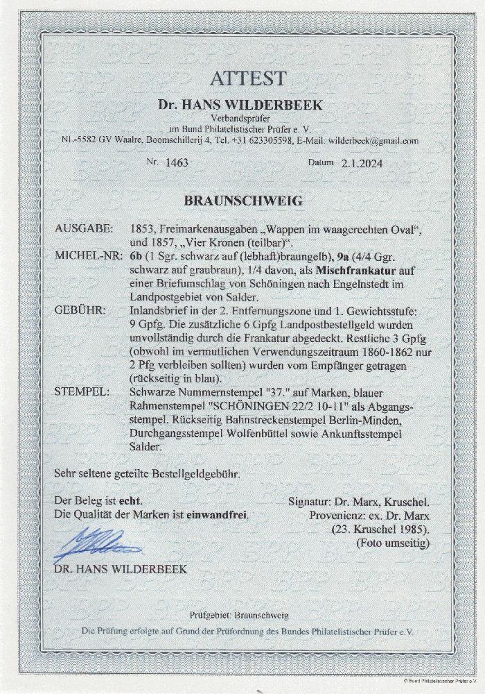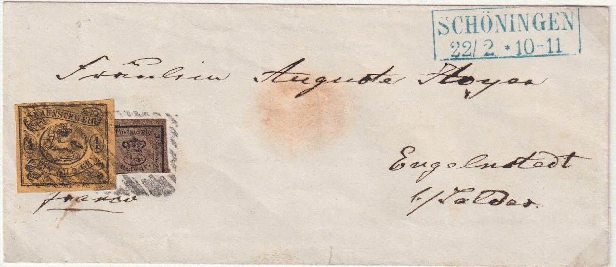 | Zusatzinformationen und Suchstichworte: | Südphila P. Feuser 101. Auktion 16. März 2024 Los 136 Altdeutschland Braunschweig 1 Sgr. a. sämisch nebst 1/4 Ggr. a. braun, Kabinettstücke mit Stempel "37" Schöningen auf Damenbrief "franco" nach Engelnstedt bei Salder, als ganz freigemachter Brief beträgt das Porto 15 Gutepfennige, freigemacht sind 12 Gutepfenninge, vom Landbriefträger wurden deshalb noch die rs. vermerkten 3 Pfennige eingezogen Ausruf 200,00 EUR |