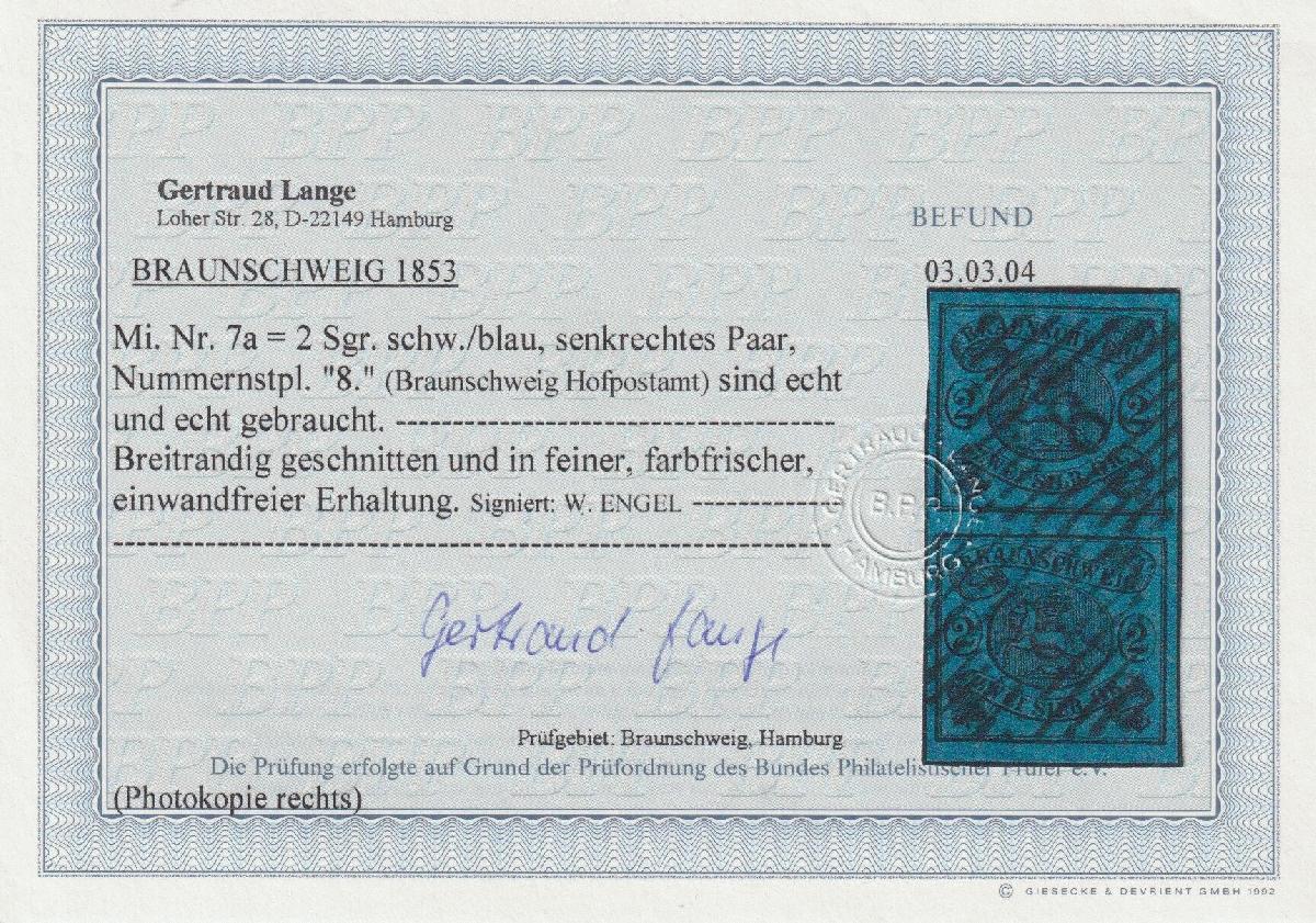 | Zusatzinformationen und Suchstichworte: | Südphila P. Feuser 101. Auktion 16. März 2024 Los 142 Altdeutschland Braunschweig 2 Sgr. a. blau, breitrandiges senkr. Kabinettpaar mit Stempel "8" Braunschweig Ausruf 100,00 EUR |