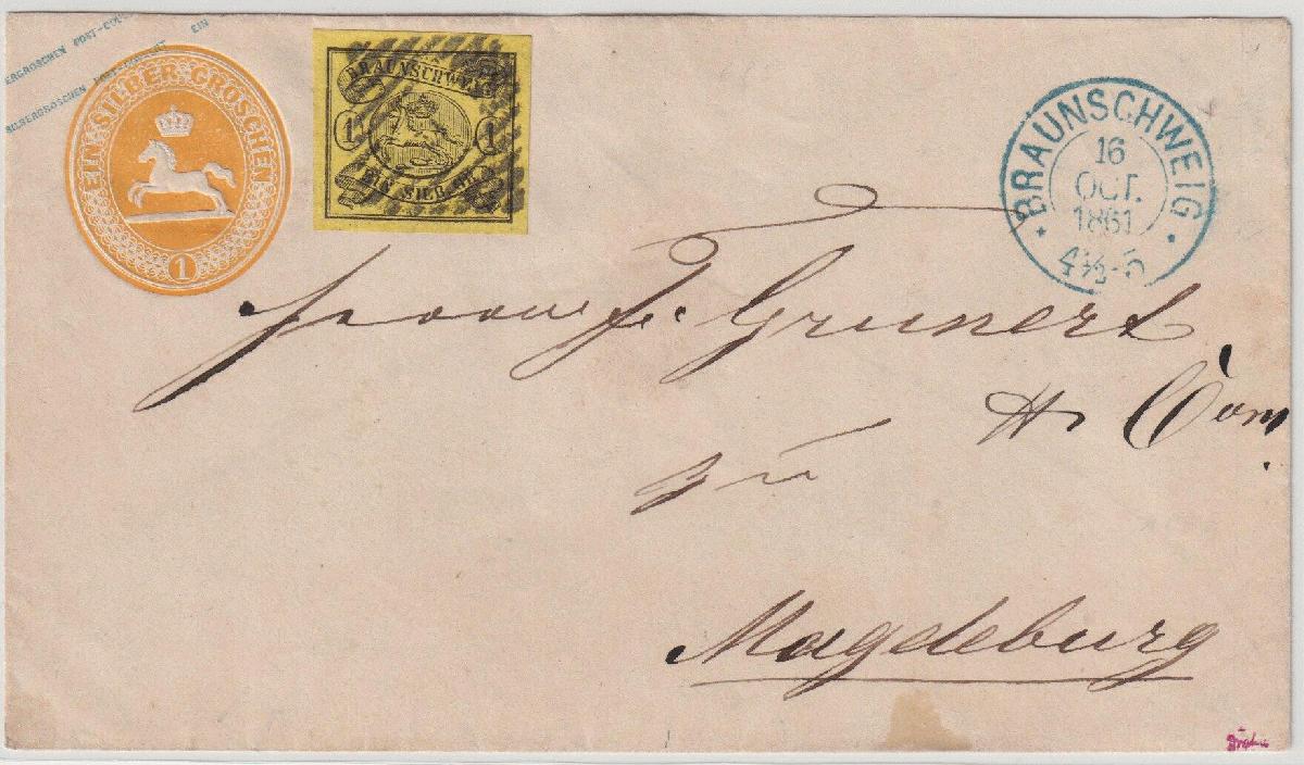 | Zusatzinformationen und Suchstichworte: | Südphila P. Feuser 101. Auktion 16. März 2024 Los 241 Altdeutschland Braunschweig 1 Sgr. a. gelb, breitrandiges Luxusstück mit Stempel "9" Braunschweig auf Couvert 1 Sgr. gelb nach Magdeburg Ausruf 200,00 EUR |