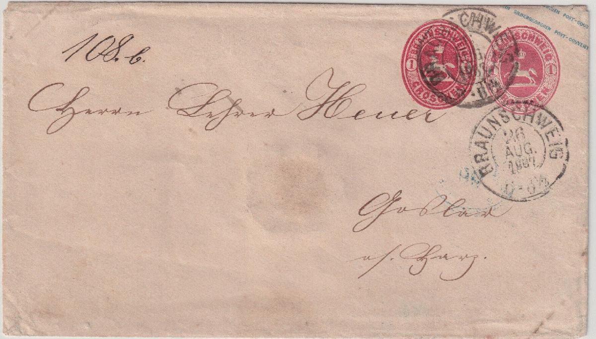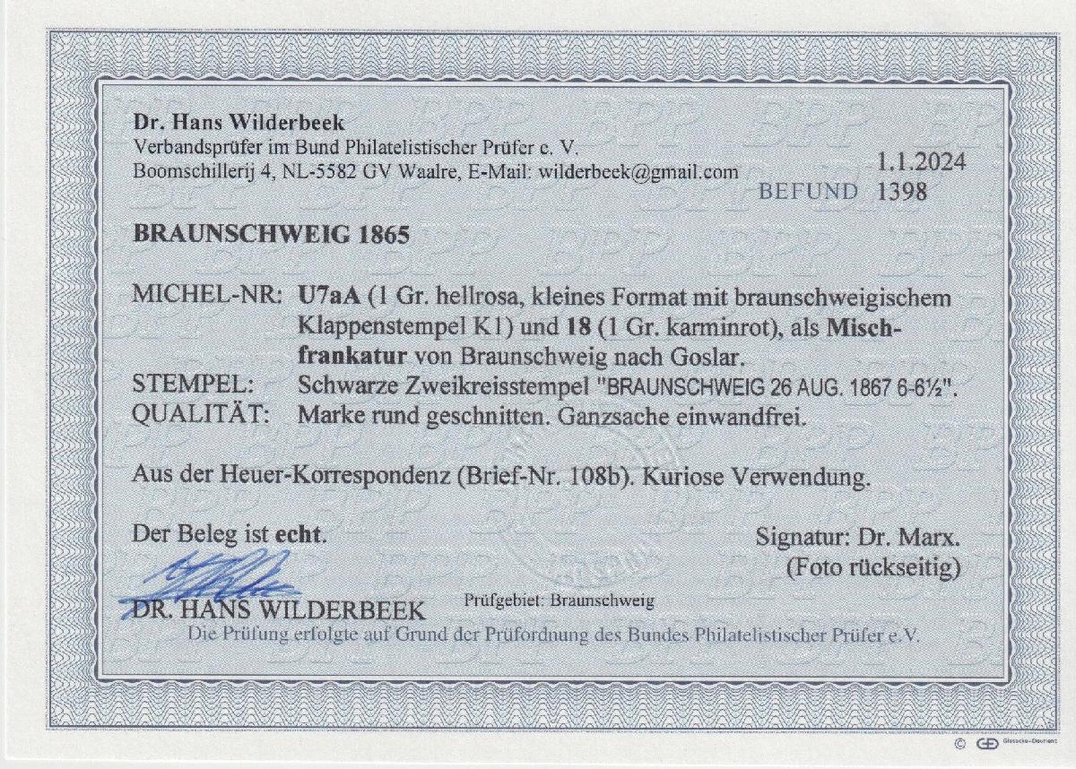 | Zusatzinformationen und Suchstichworte: | Südphila P. Feuser 101. Auktion 16. März 2024 Los 295 Altdeutschland Braunschweig 1 Gr. karmin, rundgeschnitten mit K2 BRAUNSCHWEIG auf Couvert 2 Gr. karmin nach Goslar Ausruf 100,00 EUR |