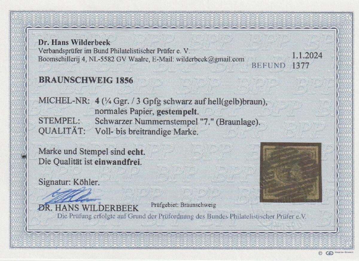| Zusatzinformationen und Suchstichworte: | Südphila P. Feuser 101. Auktion 16. März 2024 Los 338 Altdeutschland Braunschweig "7" Braunlage, besonders schön auf Luxusstück 1/4 Gr. a. braun Ausruf 150,00 EUR |