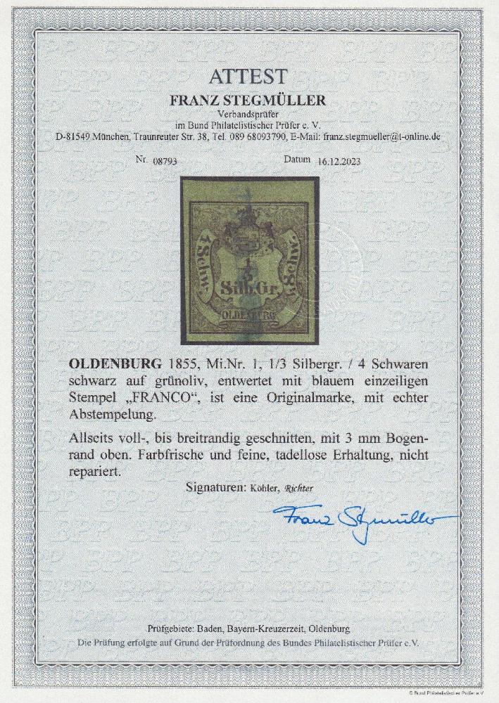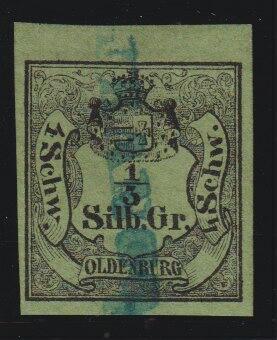 | Zusatzinformationen und Suchstichworte: | Südphila P. Feuser 101. Auktion 16. März 2024 Los 1000 Altdeutschland Oldenburg 1/3 Sgr. a. grün, breitrandiges Kabinettstück mit kleinem Oberrand, seltene Entwertung mit L1 FRANCO Ausruf 250,00 EUR |