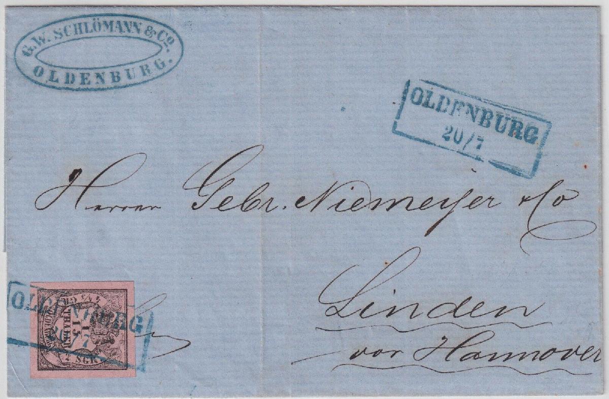 | Zusatzinformationen und Suchstichworte: | Südphila P. Feuser 101. Auktion 16. März 2024 Los 1044 Altdeutschland Oldenburg 1/15 Th. a. rosa, seltene Type III, sehr breitrandig mit R2 OLDENBURG auf blauem Luxusbrief nach Linden bei Hannover (doppelte Gewichtsstufe), dek. Absenderstempel Ausruf 200,00 EUR |