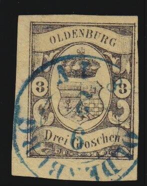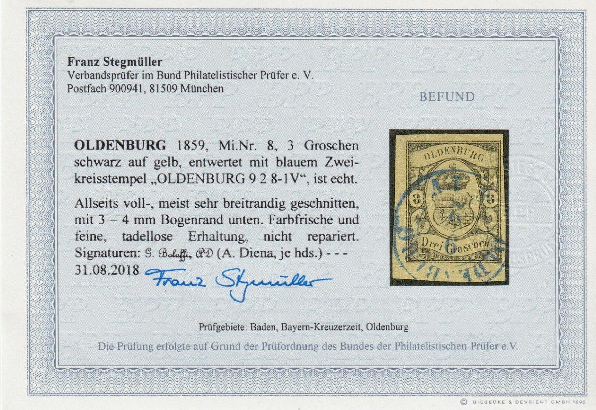 | Zusatzinformationen und Suchstichworte: | Südphila P. Feuser 101. Auktion 16. März 2024 Los 1083 Altdeutschland Oldenburg 3 Gr. a. gelb, besonders breitrandiges Luxusstück mit 4 mm unterem Bogenrand und sauberem K2 OLDENBURG Ausruf 200,00 EUR |