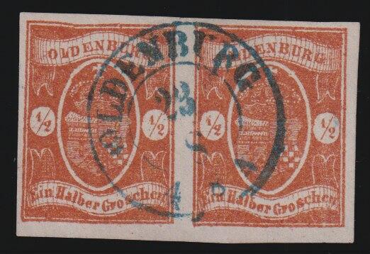 | Zusatzinformationen und Suchstichworte: | Südphila P. Feuser 101. Auktion 16. März 2024 Los 1106 Altdeutschland Oldenburg 1/2 Gr. braunorange, besonders schönes breitrandiges Paar mit zentrischem K2 OLDENBURG (rechte Marke Bugspur), linke Marke kl. Plattenfehler Ausruf 200,00 EUR |