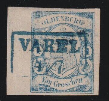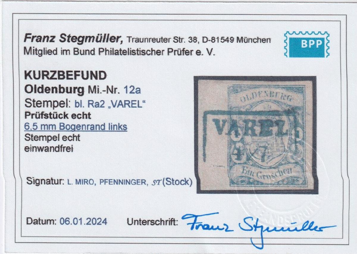 | Zusatzinformationen und Suchstichworte: | Südphila P. Feuser 101. Auktion 16. März 2024 Los 1117 Altdeutschland Oldenburg 1 Gr. hellblau, breitrandiges Luxusstück mit sehr schönem R2 VAREL, links 6,5 mm breiter Bogenrand, ein Ausnahmestück Ausruf 250,00 EUR |