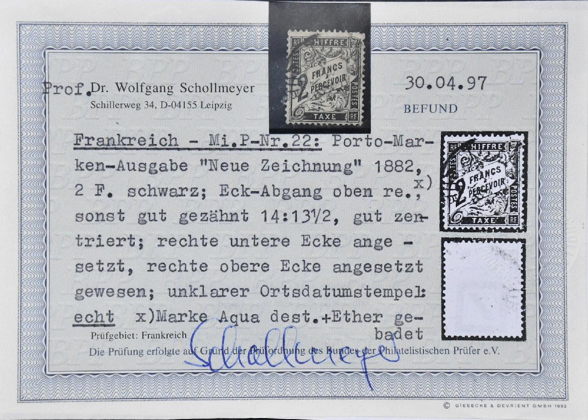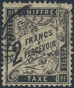 | Zusatzinformationen und Suchstichworte: | AB Philea Auktion #2401 17. Januar 2024 Los 6638 Frankreich France, Postage due Michel 22 used, 1882 New numeral 2 Fr black. One corner heavily repaired Ausruf 18,00 EUR |
