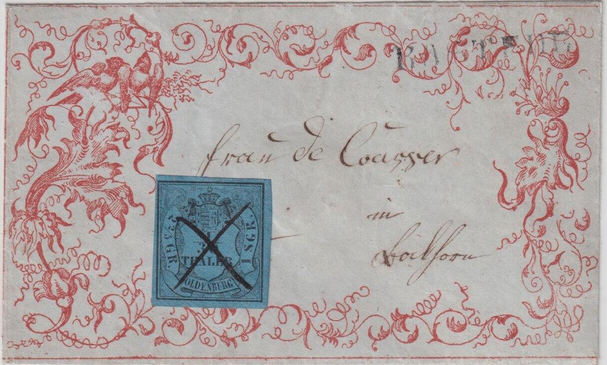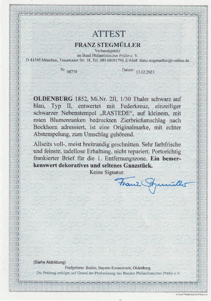 | Zusatzinformationen und Suchstichworte: | Südphila P. Feuser 101. Auktion 16. März 2024 Los 1015 Altdeutschland Oldenburg 1/30 Th. a. blau, breitrandiges Luxusstück mit dekorativem Federkreuz nebst schwarzem L1 RASTEDE auf entzückendem kleinem Couvert mit großartiger roter Blumenrankenverzierung (mit Vögeln) vorder- und rückseitig, ein besonders schöner farbiger Steindruck-Zierbrief Ausruf 1.000,00 EUR |