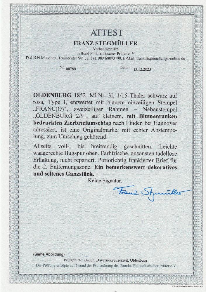 | Zusatzinformationen und Suchstichworte: | Südphila P. Feuser 101. Auktion 16. März 2024 Los 1027 Altdeutschland Oldenburg 1/15 Th. a. rosa, breitrandig (kl. Druckspur vom Inhalt) mit L1 FRANCO nebst R2 OLDENBURG auf entzückendem, sehr kleinem Zierbrief nach Linden (bei Hannover), mit der außergewöhnlich reichhaltigen Rankenverzierung ein Liebhaberstück Ausruf 1.000,00 EUR |
