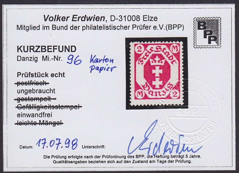 | Zusatzinformationen und Suchstichworte: | Uwe von Poblocki Los 0948700182 Danzig 1922, 2 M. rot auf Kartonpapier aus geklebter Papierbahn, einwandfrei ungebraucht, selten! Kurzbefund Erdwien BPP (1998) Festpreis 45,00 EUR |