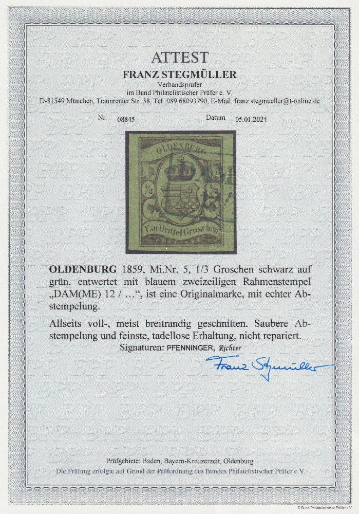 | Zusatzinformationen und Suchstichworte: | Südphila P. Feuser 101. Auktion 16. März 2024 Los 1051 Altdeutschland Oldenburg 1/3 Gr. a. grün, breitrandiges und farbfrisches Luxusstück mit klarem R2 DAMME, ein besonders schönes Exemplar der seltenen Altdeutschland-Marke Ausruf 1.000,00 EUR |