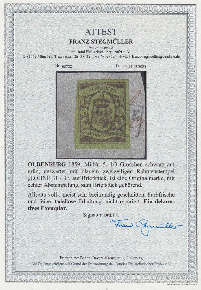 | Zusatzinformationen und Suchstichworte: | Südphila P. Feuser 101. Auktion 16. März 2024 Los 1054 Altdeutschland Oldenburg 1/3 Gr. a. grün, allseits breitrandig und farbfrisch mit klarem R2 LOHNE auf besonders schönem Luxus-Briefstück, ein hervorragendes Exemplar der Altdeutschland-Rarität Ausruf 1.500,00 EUR |