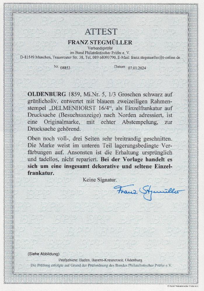 | Zusatzinformationen und Suchstichworte: | Südphila P. Feuser 101. Auktion 16. März 2024 Los 1055 Altdeutschland Oldenburg 1/3 Gr. a. grün, noch voll- bis breitrandiges Prachtstück (min. Verfärbung unten links) mit R2 DELMENHORST auf dek. Vertreterdrucksache nach Norden (lith. Inhalt), eine große Altdeutschland-Seltenheit Ausruf 4.000,00 EUR |