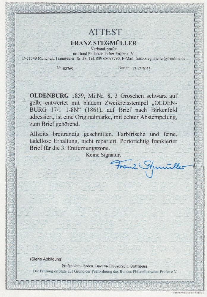 | Zusatzinformationen und Suchstichworte: | Südphila P. Feuser 101. Auktion 16. März 2024 Los 1087 Altdeutschland Oldenburg 3 Gr. a. gelb, allseits breitrandig und farbfrisch mit K2 OLDENBURG auf Prachtbrief nach Birkenfeld, Ausruf 600,00 EUR |