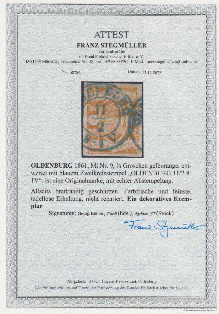 | Zusatzinformationen und Suchstichworte: | Südphila P. Feuser 101. Auktion 16. März 2024 Los 1094 Altdeutschland Oldenburg 1/4 Gr. gelborange, farbfrisches Kabinettstück mit allseits breiten Rändern, ein schönes Exemplar der Altdeutschland-Rarität Ausruf 1.000,00 EUR |