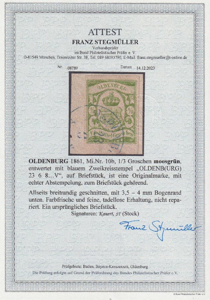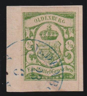 | Zusatzinformationen und Suchstichworte: | Südphila P. Feuser 101. Auktion 16. März 2024 Los 1102 Altdeutschland Oldenburg 1/3 Gr. moosgrün, unten 4 mm Bogenrand, breitrandig und farbfrisch mit K2 OLDENBURG auf Luxus-Briefstück, in so schöner Erhaltung eine Seltenheit Ausruf 800,00 EUR |