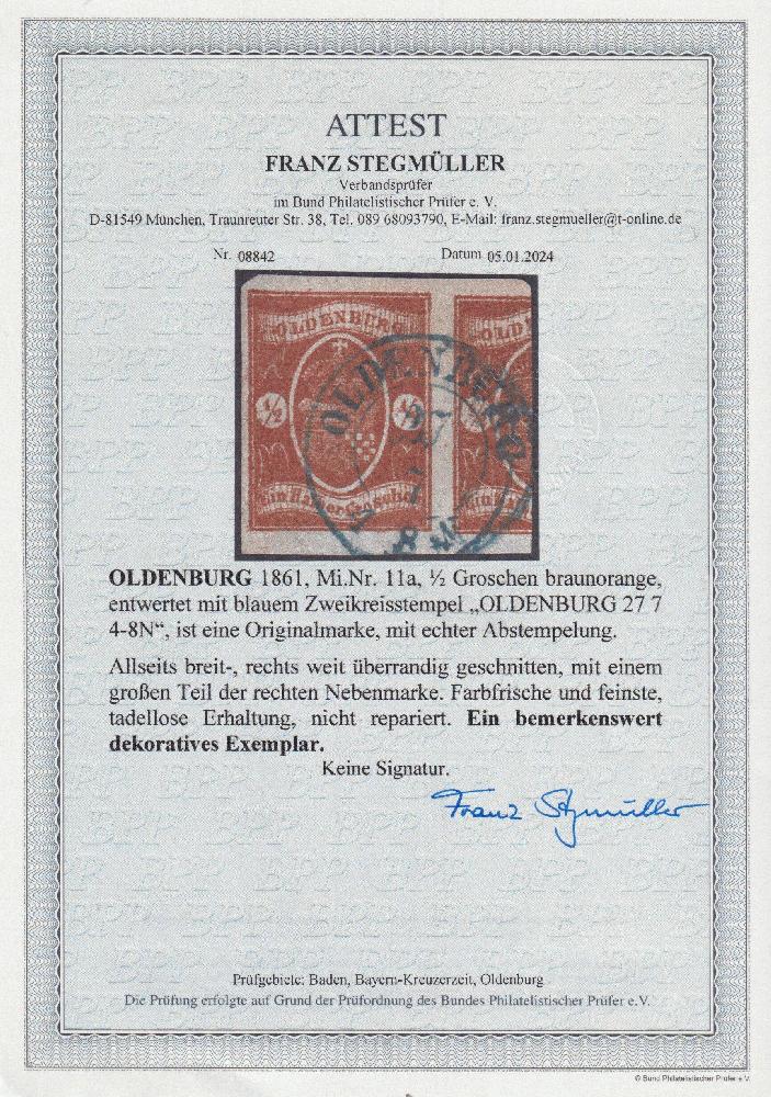 | Zusatzinformationen und Suchstichworte: | Südphila P. Feuser 101. Auktion 16. März 2024 Los 1105 Altdeutschland Oldenburg 1/2 Gr. braunorange, extrem breitrandiges Luxusstück (rechts großer Teil der Nebenmarke) mit K2 OLDENBURG, ein Ausnahmestück Ausruf 250,00 EUR |