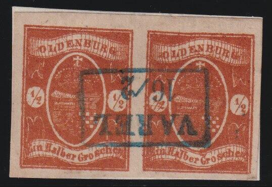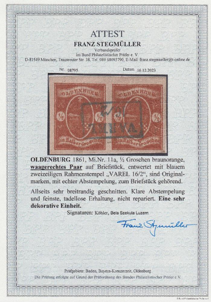 | Zusatzinformationen und Suchstichworte: | Südphila P. Feuser 101. Auktion 16. März 2024 Los 1107 Altdeutschland Oldenburg 1/2 Gr. braunorange, breitrandiges und farbfrisches waagr. Paar mit kopfsteh. R2 VAREL auf Luxus-Briefstück, Ausruf 600,00 EUR |