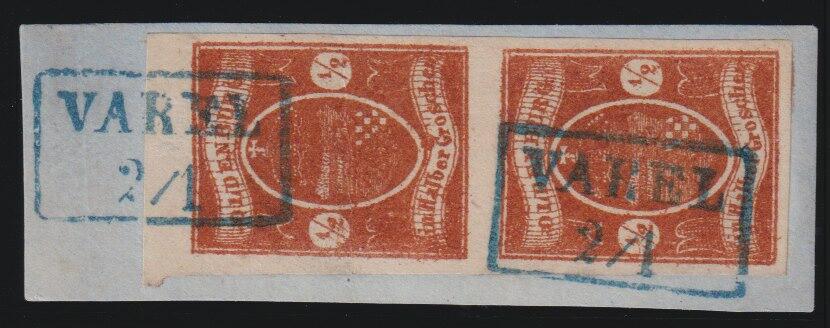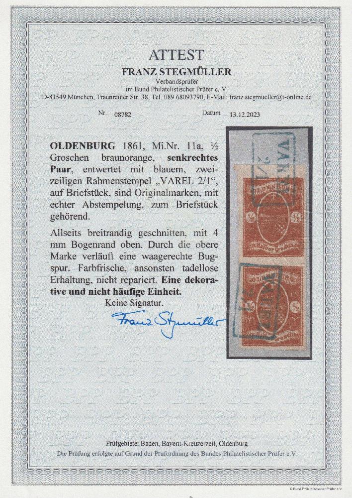 | Zusatzinformationen und Suchstichworte: | Südphila P. Feuser 101. Auktion 16. März 2024 Los 1109 Altdeutschland Oldenburg 1/2 Gr. braunorange, sehr schönes senkrechtes Paar (obere Marke Bugspur, 4 mm Bogenrand) mit R2 VAREL auf dekorativem Briefstück Ausruf 400,00 EUR |