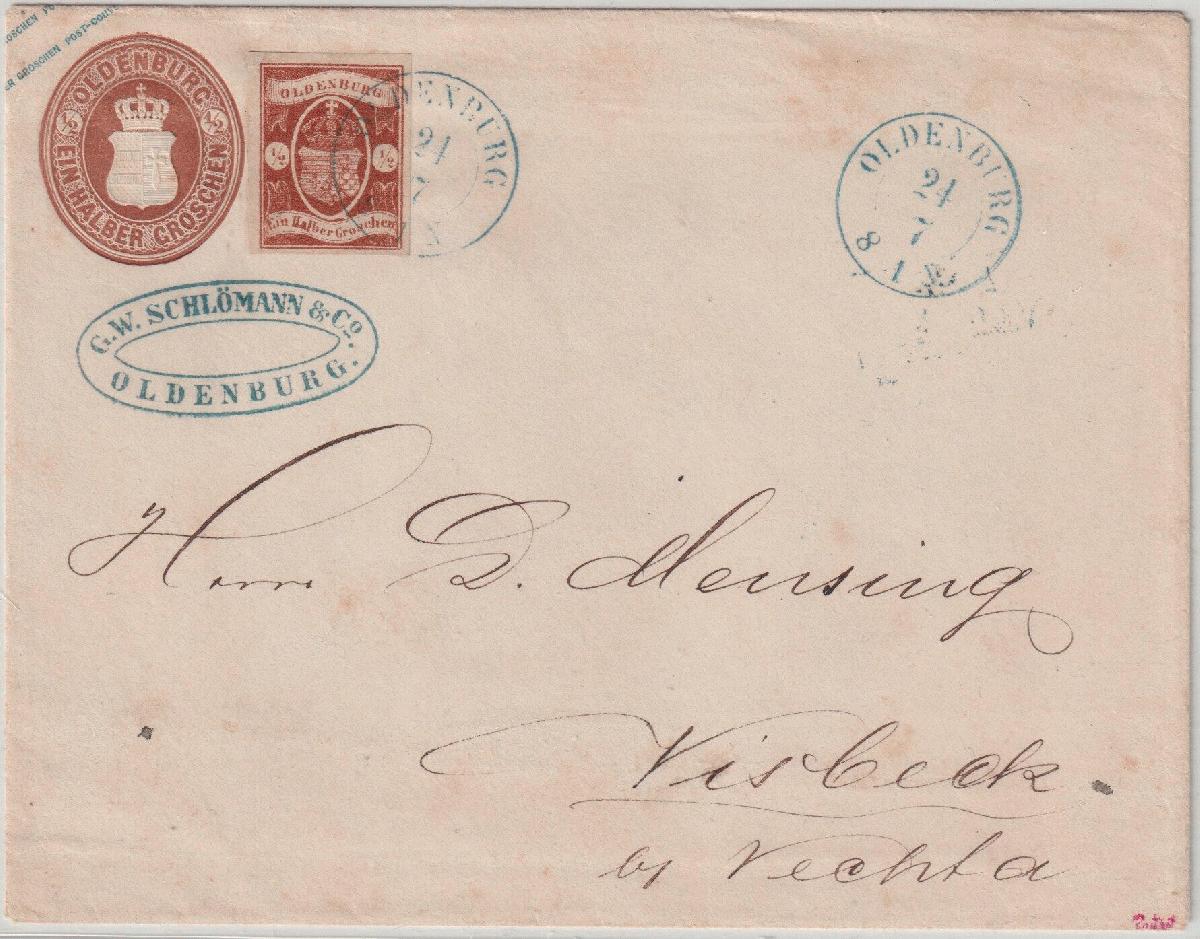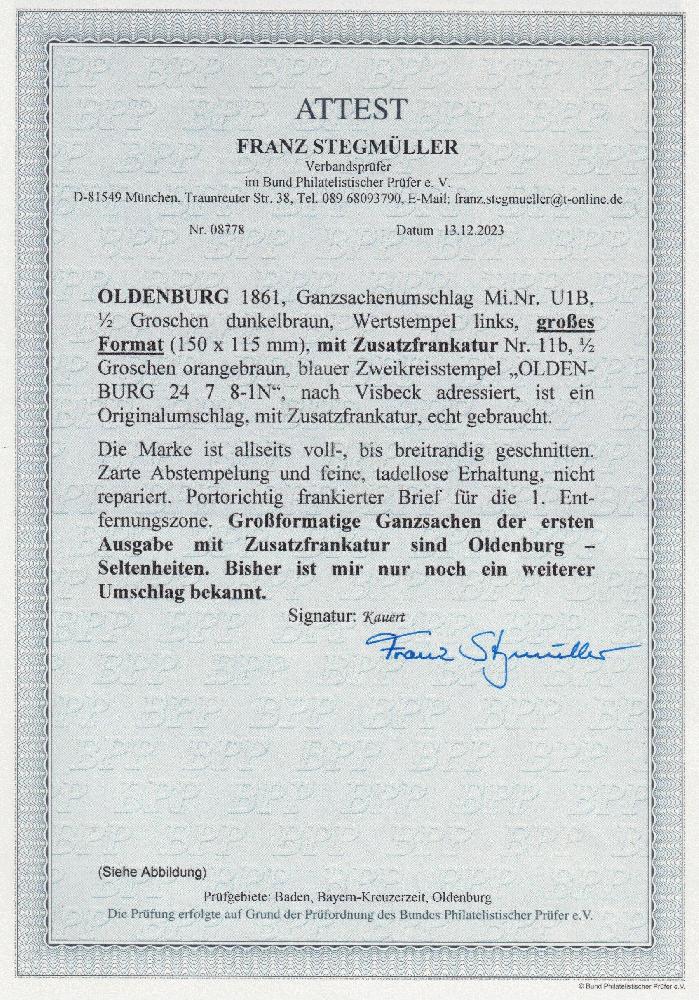 | Zusatzinformationen und Suchstichworte: | Südphila P. Feuser 101. Auktion 16. März 2024 Los 1110 Altdeutschland Oldenburg 1/2 Gr. orangebraun, breitrandiges und farbfrisches Luxusstück mit K2 OLDENBURG auf großformatigem Couvert 1/2 Gr. dunkelbraun nach Visbeck bei Vechta (dekorativer Firmenstempel G.W. Schlömann & Co.), der großformatige 1/2 Groschen-Umschlag ist (mit Strelitz U3B) mit einer Auflage von nur 1.100 Stück der seltenste aller altdeutschen Staaten, mit Zusatzfrankatur ein Unikat (von allen gebrauchten großform. Couverts ist nur noch ein weiterer mit Zusatzfrankatur bekannt, darüber hinaus sind nur zwei weitere gebrauchte Umschläge bekannt), eines der wertvollsten Stücke der Oldenburg-Philatelie in sehr guter Erhaltung Ausruf 15.000,00 EUR |