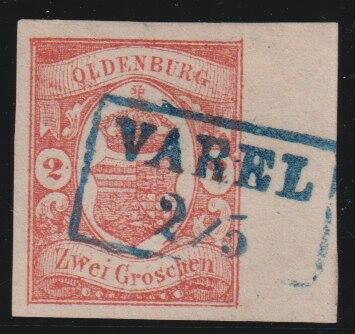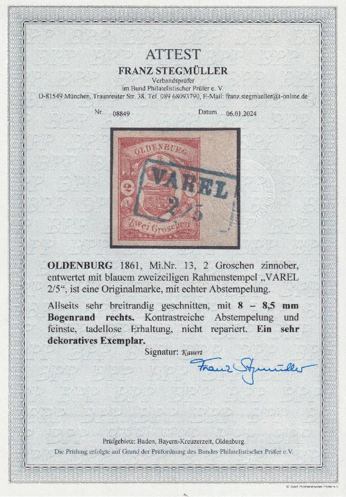 | Zusatzinformationen und Suchstichworte: | Südphila P. Feuser 101. Auktion 16. März 2024 Los 1132 Altdeutschland Oldenburg 2 Gr. rot, ein fabelhaftes Luxus-Randstück (rechts 8 mm Bogenrand) mit schönem R2 VAREL, ein bemerkenswertes Qualitätsstück Ausruf 400,00 EUR |