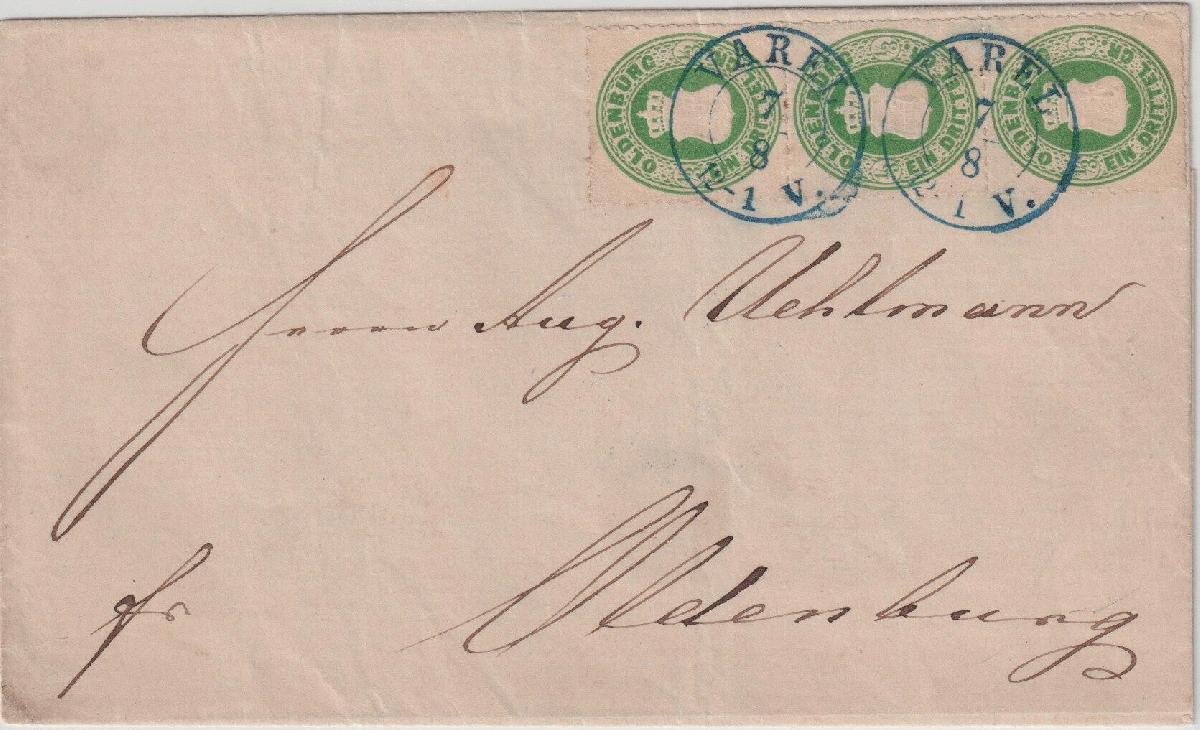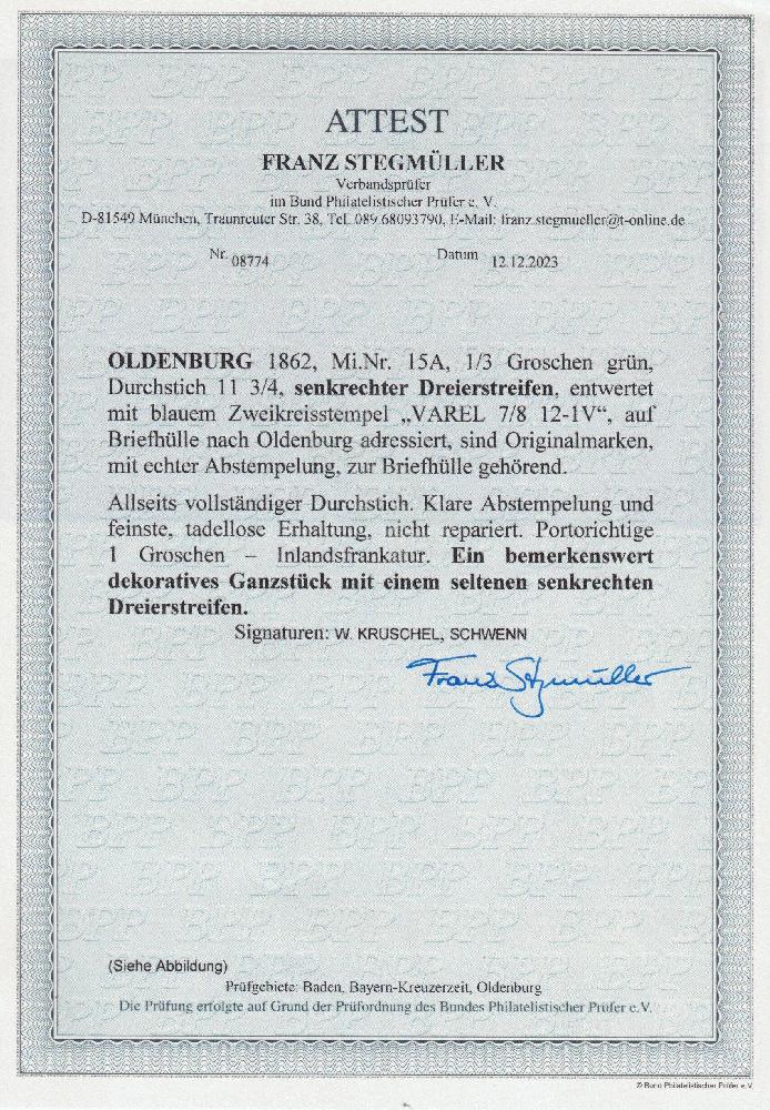 | Zusatzinformationen und Suchstichworte: | Südphila P. Feuser 101. Auktion 16. März 2024 Los 1142 Altdeutschland Oldenburg 1/3 Gr. grün, senkr. Luxus-Dreierstreifen mit vollem Durchstich und schönem K2 VAREL auf Luxusbrief nach Oldenburg. ("Ein bemerkenswert dekoratives Ganzstück mit einem seltenen senkrechten Dreierstreifen") Ausruf 1.500,00 EUR |