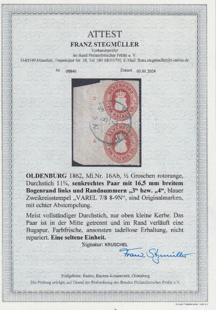 | Zusatzinformationen und Suchstichworte: | Südphila P. Feuser 101. Auktion 16. März 2024 Los 1144 Altdeutschland Oldenburg 1/2 Gr. rotorange, ein bemerkenswert schönes und seltenes senkr. Randpaar (oben winzige Durchstichkerbe, mittig Durchstich weitgehend getrennt), links 16,5 mm breiter Bogenrand mit Reihenzahlen "3" und "4", ein Ausnahmestück Ausruf 500,00 EUR |