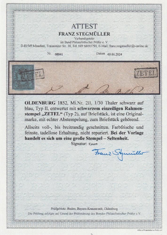 | Zusatzinformationen und Suchstichworte: | Südphila P. Feuser 101. Auktion 16. März 2024 Los 1181 Altdeutschland Oldenburg ZETEL, der äußerst seltene R1 nebst Zweitabschlag auf Luxus-Briefstück 1/30 Th. a. blau, der seltenste Oldenburger Stempel auf einem besonders schönem Briefstück, Liebhaberwert Ausruf 1.000,00 EUR |