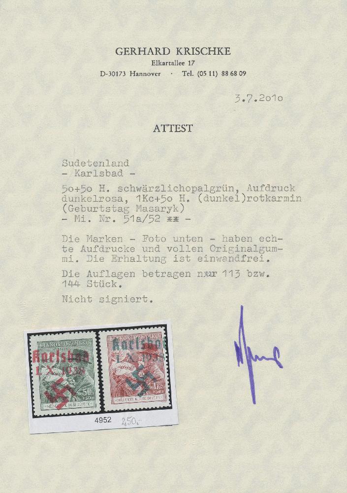 | Zusatzinformationen und Suchstichworte: | Christoph Gärtner 58. Aution 19. - 23. Februar 2024 Los 5960 D Sudetenland Karlsbad Masaryk mit Kind, 50h + 50 h und 1 Kc + 50 h. postfrisch, Attest Krischke "echte Aufdrucke, volle Originalgummierung. Die Erhaltung ist einwandfrei". Auflage nur 113 Sätze Zuschlag 210,00 EUR |