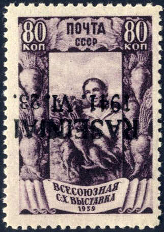 | Zusatzinformationen und Suchstichworte: | Viennafil 83. Live-Auktion 21. - 23. November 2023 Los 1680 Deutsche Besetzung II. WK Litauen Raseiniai 1941, 80 K schwarzgraupurpur mit kopfstehendem Aufdruck Ausruf 180,00 EUR |
