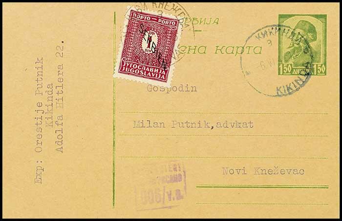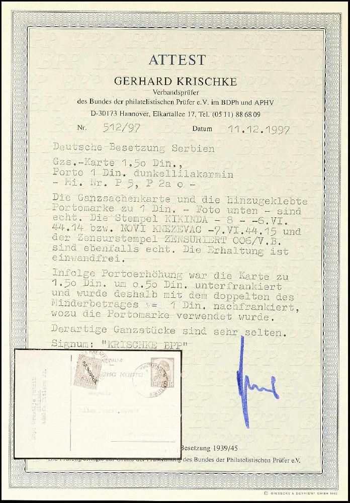 | Zusatzinformationen und Suchstichworte: | Dr. Reinhard Fischer 196. Auktion 1. - 3. Februar 2024 Los 4407 Deutsche Besetzung II. WK Serbien Ganzsachenkarte mit Wert-Stpl. 1,50 Din. nach Novi Knezevac mit Aufgabe-Stpl. KIKINDA/8 vom 6.6.44 und Zensur-Stpl. 008/V.B. der Zensurstelle Grossbetschkerek sowie mit Portomarke über 1 Din. mit Stpl. NOVI KNEZEVAC/3 vom 7.6.44 für Nach- und Strafporto wegen unzureichender Frankierung, da das Porto für Orts- und Inlandskarten ab 1.6.1944 auf 2 Din. erhöht worden war. Einwandfreie Erhaltung Ausruf 150,00 EUR |