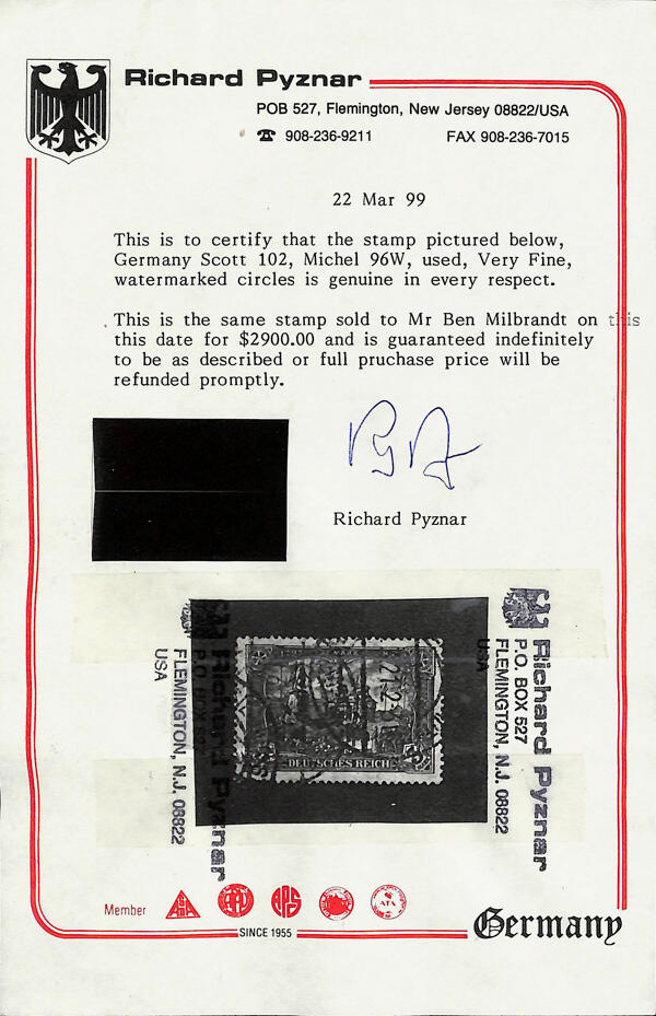 | Zusatzinformationen und Suchstichworte: | Kelleher 795. Auktion 11. - 13. März 2024 Los 1357 Deutsches Reich, Germania mit WZ 1920, 3m schwarzviolett, Wasserzeichen umkreist (Scott 102), frisch und einwandfrei mit kräftiger Farbe; gut zentriert Ausruf 750,00 USD |