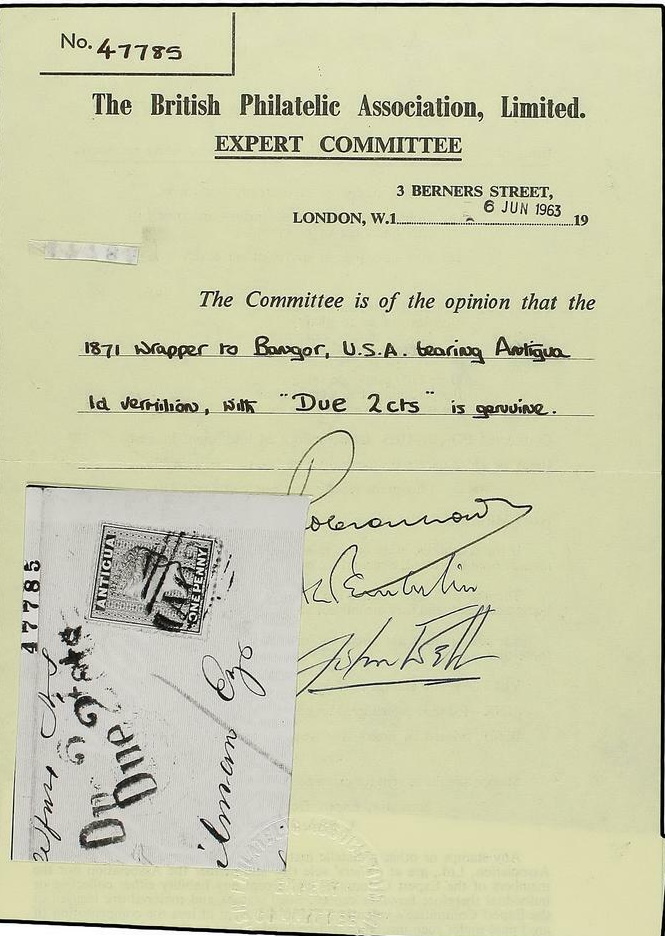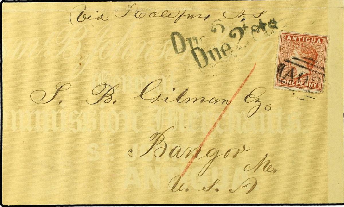 | Zusatzinformationen und Suchstichworte: | Soler y Llach - 799. Auktion - Briefmarken und Belege aus aller Welt 6. Februar 2024 Los 538 Antigua und Antigua Barbuda ANTIGUA. 1871 (April 27). Bedruckter Umschlag (Anschrift des Absenders) ab Antigua über Halifax, Neuschottland nach Bangor, USA mit 1867 1 d. zinnober entwertet mit ´AO2´ Stempel in schwarz, rot handschriftlich ´1´ in Pastell. Gestempelt mit Einzeiler ´Due 2 cts. ´ in schwarz bei der Ankunft Ausruf 300,00 EUR |