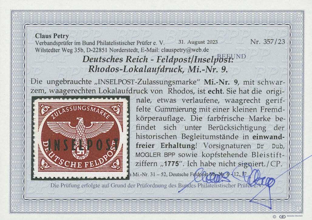| Zusatzinformationen und Suchstichworte: | Ulrich Felzmann 180. Auktion 14. März 2024 Los 3254 Deutsche Besetzung II. WK, Feldpostmarken Rhodos Päckchenmarke postfrisch mit etwas verlaufener Gummierung mit kleiner Fremdkörperauflage, darüber hinaus einwandfrei farbfrisch mit überdurchschnittlich gut gelungener Durchstichtrennung Ausruf 200,00 EUR |